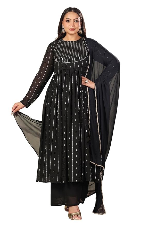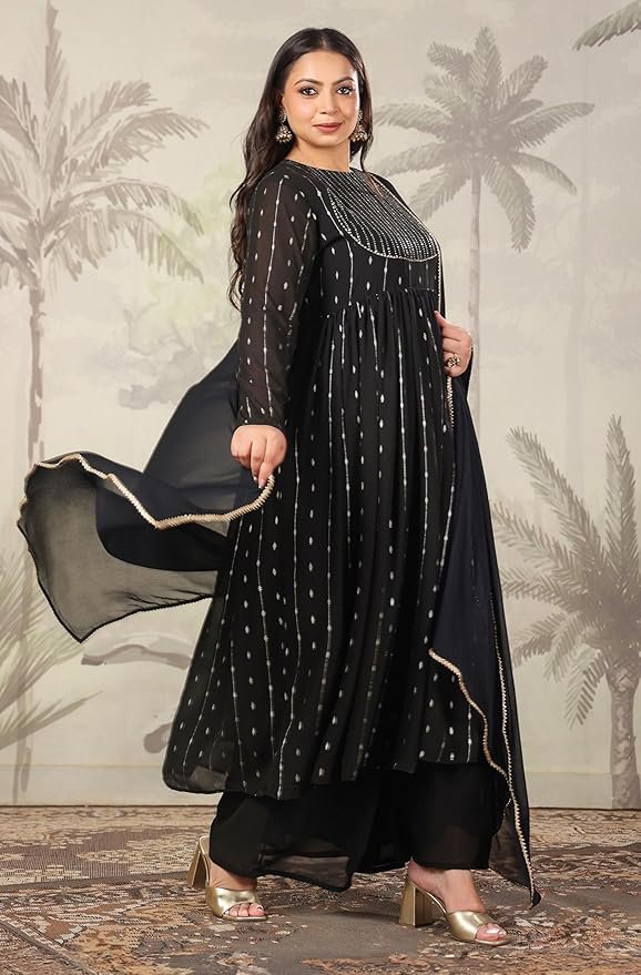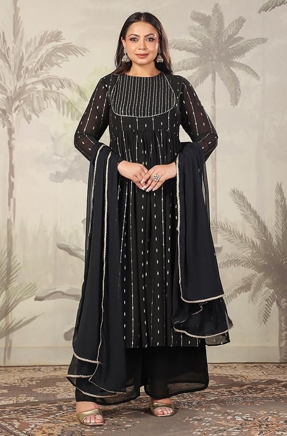 Janasya Black Georgette Kurta with Palazzo & Dupatta for Women Foil Print Print Ethnic Wear