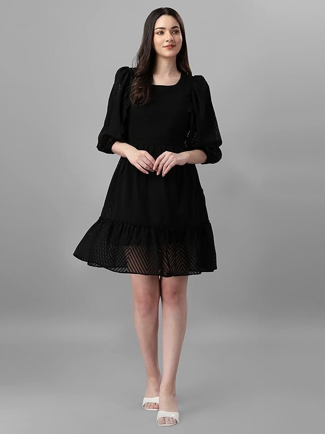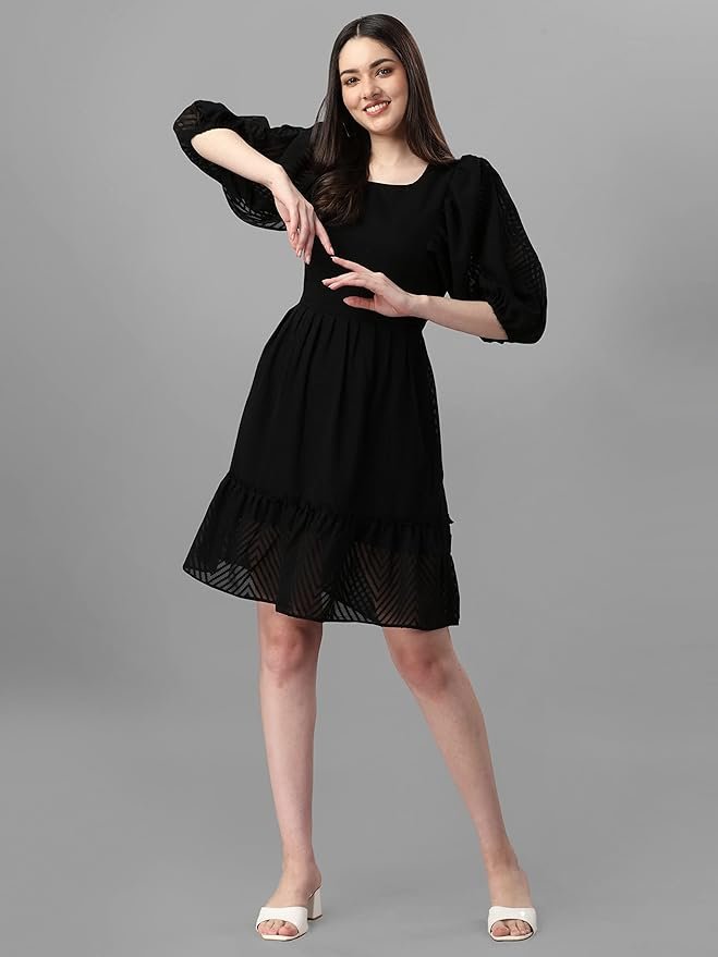 • Elegant Georgette Knee-Length Dress by Modestouze, perfect for New Year’s & Valentine’s Day with stylish puff sleeves.